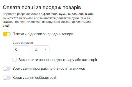 Заробітна плата за продаж товарів розраховується від фактично оплаченої суми на касі. За потреби можна враховувати або не враховувати додаткові суми: знижки, бонуси, абонементи, сертифікати, депозити та акції.