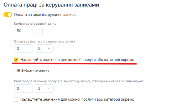 Це налаштування дозволяє задати окремий відсоток або фіксовану суму для конкретної послуги чи категорії. Для всіх інших послуг застосовується значення, вказане в Значенні за замовчуванням.