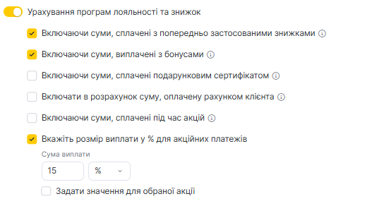 Цей блок дозволяє налаштувати, які суми враховуються під час розрахунку винагороди співробітника, якщо клієнт використовує знижки, бонуси, абонементи або бере участь в акціях.