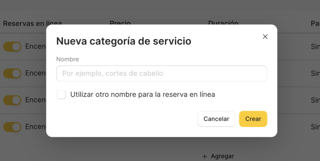 - Se abrirá una nueva ventana en la que deberás introducir el nombre de la categoría de servicio, por ejemplo, Servicios de masaje o Cortes de cabello, y hacer clic en Crear.