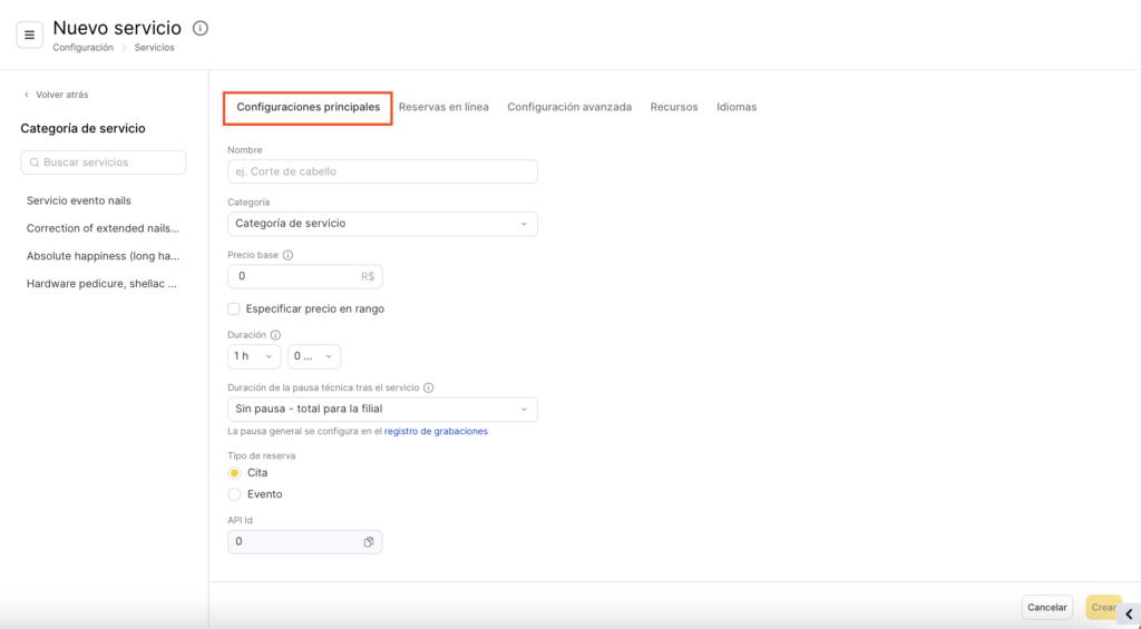 Estas configuraciones son suficientes para crear un servicio, pero se requieren configuraciones adicionales para que el sistema funcione completamente y para habilitar la reserva en línea.
