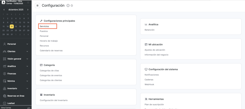 Para añadir servicios al sistema, primero debes crear las categorías de servicios y, luego, añadir los servicios dentro de esas categorías.