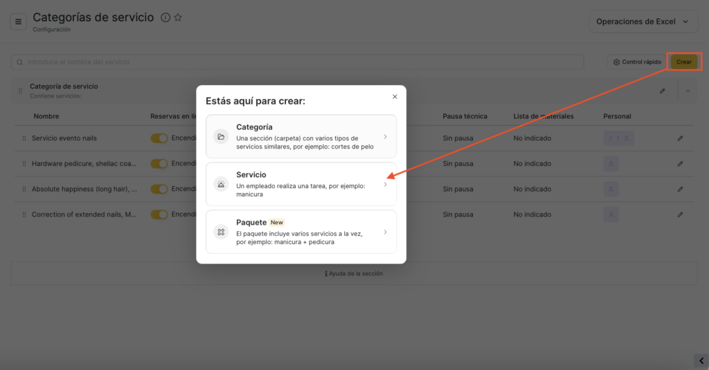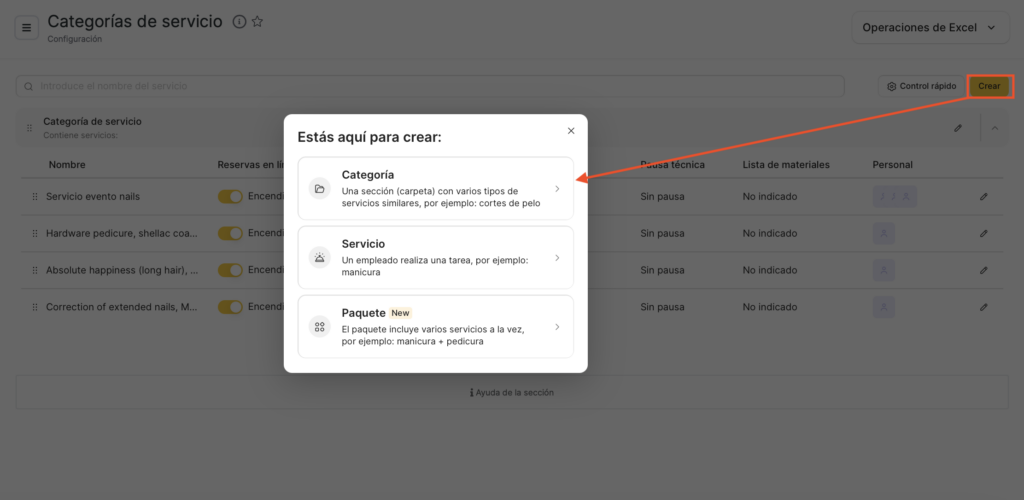 - Para añadir un servicio, haz clic en Crear > Categoría.