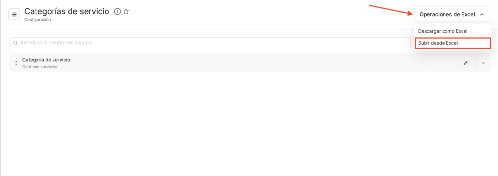 - Para cargar servicios desde un archivo de Excel, haz clic en Operaciones de Excel > Subir desde Excel en la esquina superior derecha y sigue las instrucciones que aparecen en pantalla o las indicadas en este artículo.