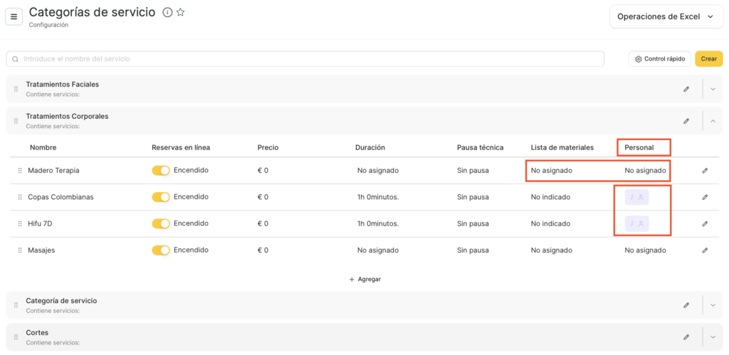 Después de configurar los servicios y completar la sección Personal, asigna a los miembros del equipo o profesionales que realizarán los servicios.