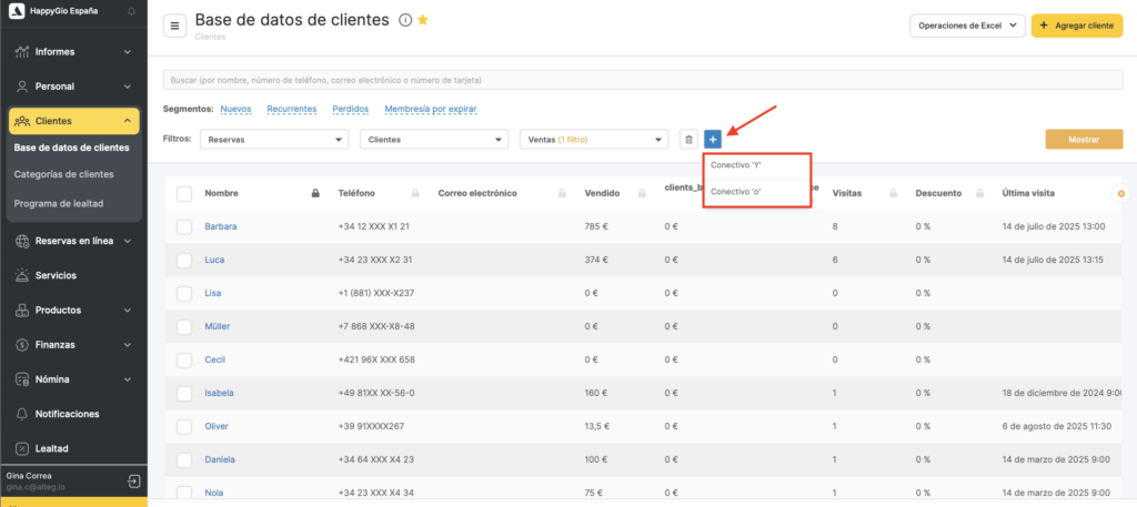 Al utilizar el conector “Y”, el sistema mostrará únicamente los clientes que cumplan todos los parámetros de los filtros seleccionados.