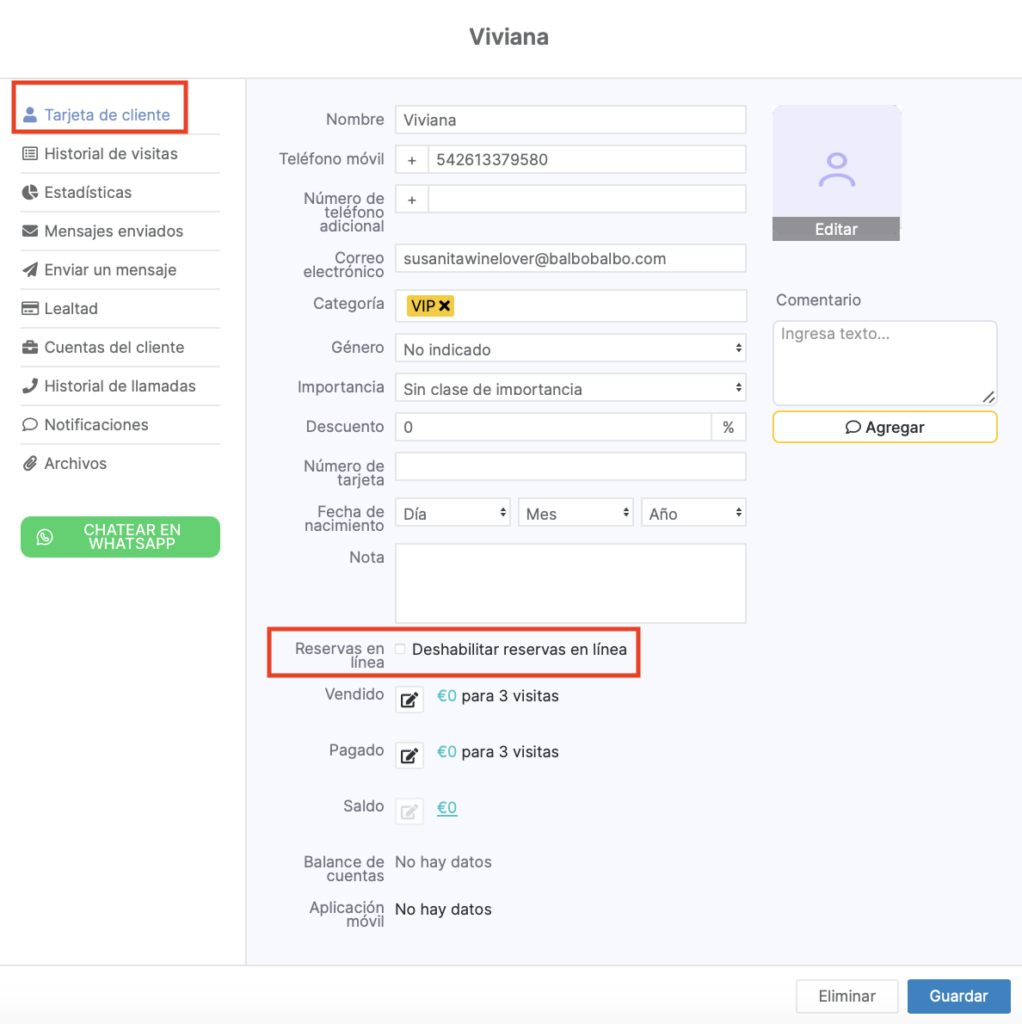 - Reserva online: marca la casilla para desactivar la reserva online para este cliente