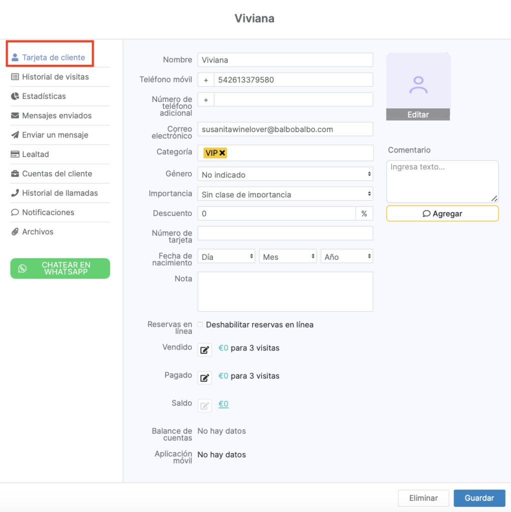En la ficha del cliente, puedes acceder a secciones que contienen toda la información disponible sobre el cliente, como datos personales, historial de reservas, detalles de citas y más.