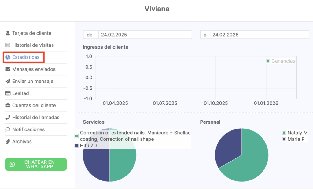 También puedes acceder rápidamente al chat de WhatsApp desde el perfil del cliente haciendo clic en el botón verde “CHAT ON WHATSAPP”.