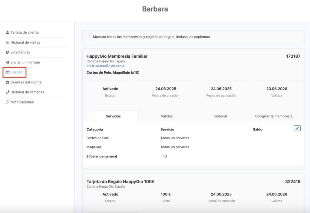 Aquí también verás todas las tarjetas regalo, membresías y tarjetas de fidelización que se hayan emitido alguna vez para este cliente, junto con la información correspondiente de cada una.