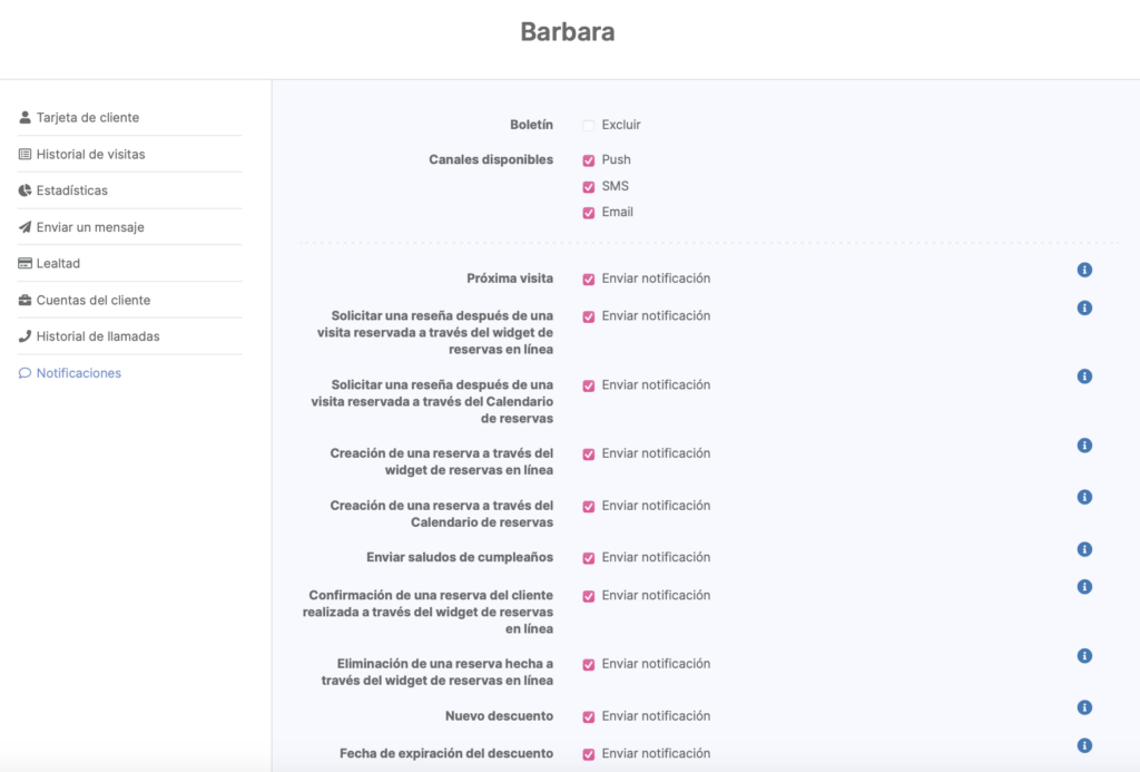Puedes configurar determinados tipos de notificaciones para que se envíen al cliente desde su ficha, o desactivar notificaciones específicas según sea necesario.