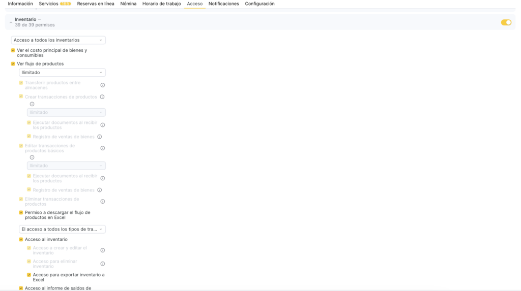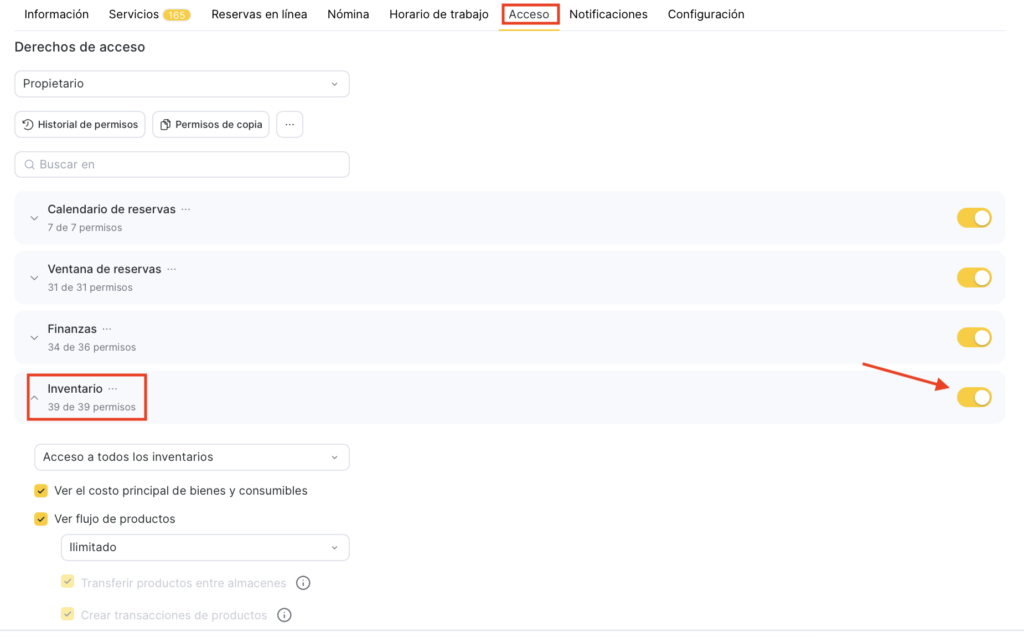 - Busca el bloque de permisos necesario y actívalo con el interruptor. Después, haz clic en el bloque Inventario y activa los permisos específicos que quieras conceder al miembro del equipo.