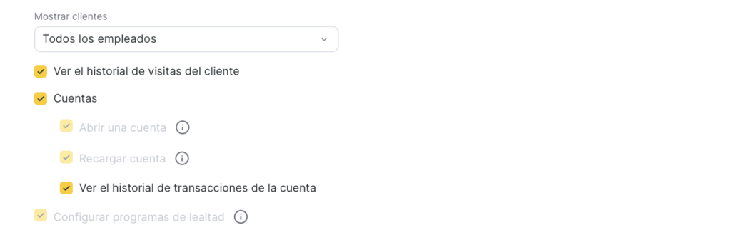 Concede acceso a la pestaña Historial de visitas, donde el miembro del equipo puede ver la lista de todas las visitas del cliente. Para abrir una cita concreta, también necesita acceso al Calendario de citas y a la Ventana de cita. - Cuentas Ver cuentas Permite ver las cuentas personales del cliente en la pestaña Cuentas del cliente, pero sin acceso al historial de transacciones ni a la posibilidad de abrir o recargar cuentas. Abrir cuenta Permite crear nuevas cuentas personales para el cliente, pero sin la posibilidad de recargarlas. Recargar cuenta Permite recargar cuentas existentes. Sin embargo, este permiso por sí solo no es suficiente: para recargar también se requieren permisos de pago/transacciones financieras, como Ventana de cita > Procesar pagos o Finanzas > Flujo de caja > Crear transacciones. Ver historial de transacciones de la cuenta. Permite ver el historial de movimientos de las cuentas personales del cliente.