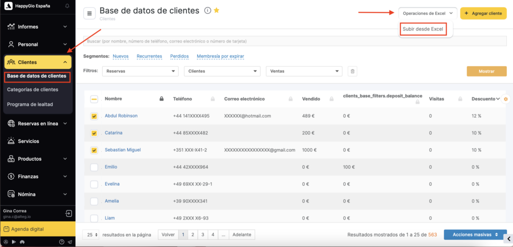 - Para subir una lista de clientes desde Excel, ve a la sección Clientes — Todos los clientes, haz clic en el botón Excel y selecciona Importar desde Excel.