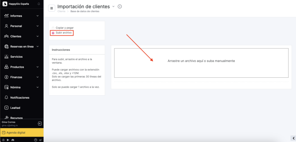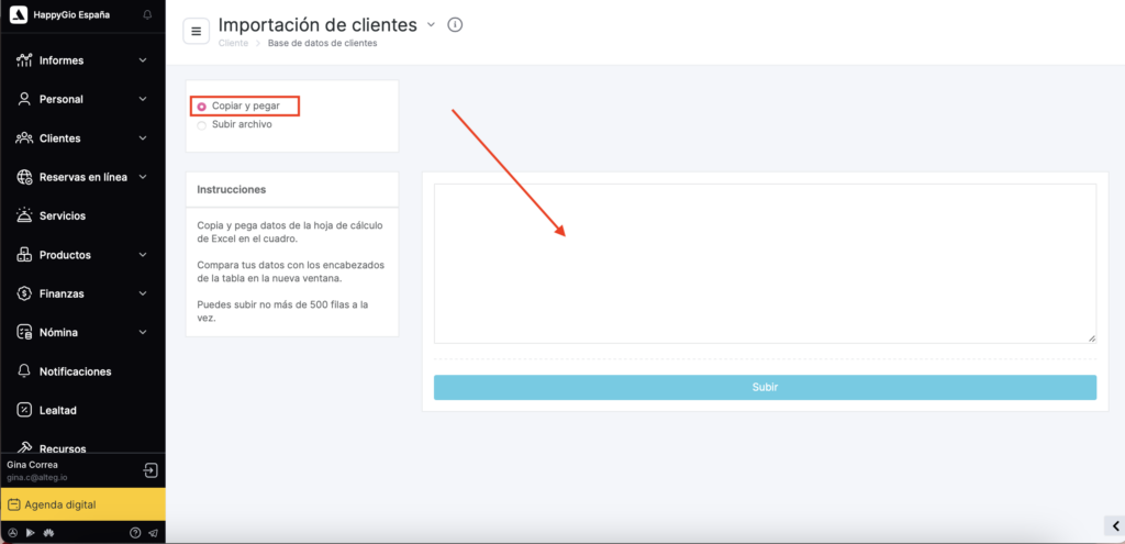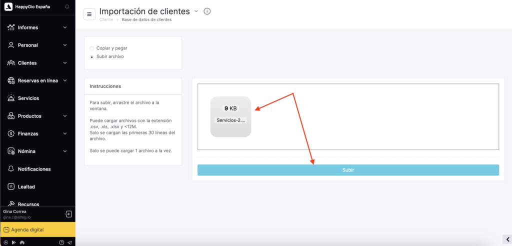 - Subir datos Puedes hacerlo de dos maneras: copiar y pegar los datos desde una hoja de Excel en la ventana de carga de Altegio, o simplemente arrastrar y soltar el archivo desde una carpeta