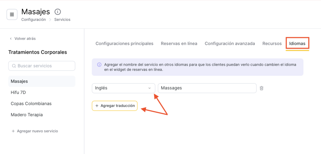 Si un cliente selecciona otro idioma durante la reserva en línea, verá el nombre de la categoría o del servicio traducido.