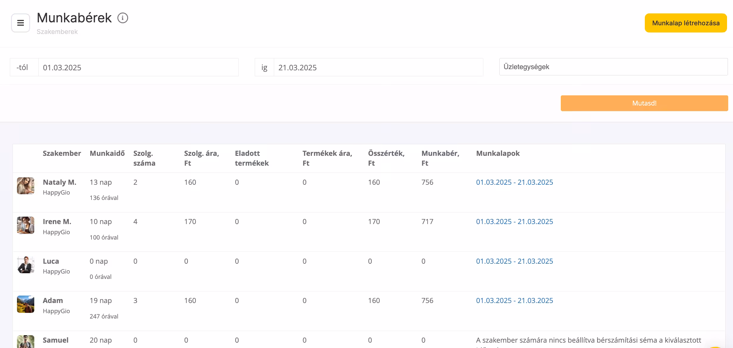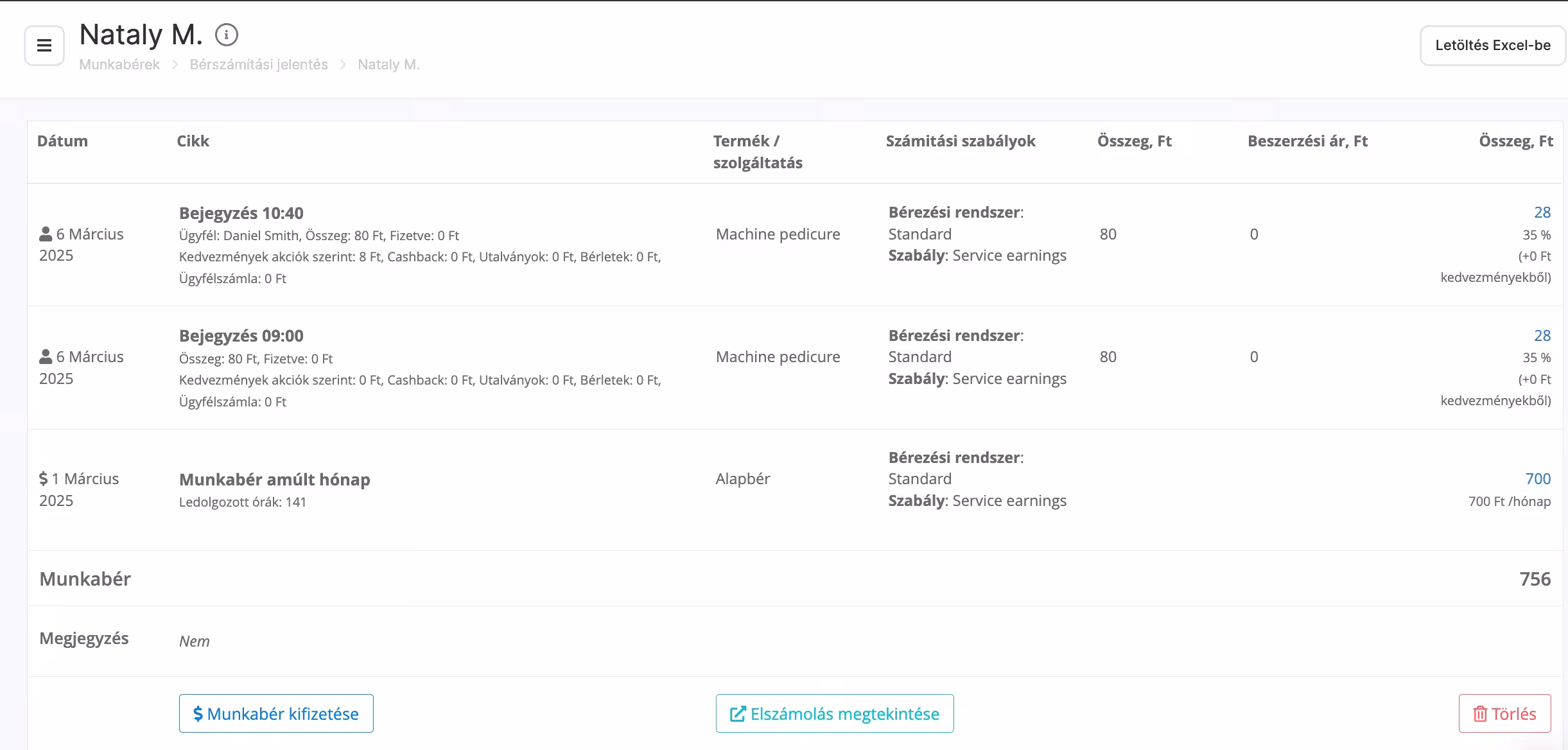 Az Altegio az egyes alkalmazottak által a kiválasztott időszakban végzett szolgáltatások alapján bérjelentéseket készít.