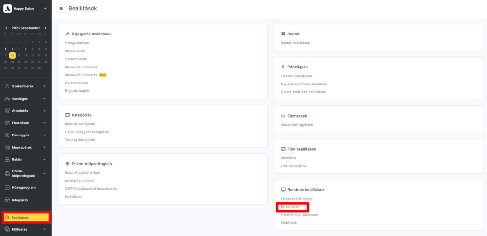 - Lépj a főmenü „Beállítások” „Rendszerbeállítások” részébe az „Értesítések” fülre és válaszd a „Értesítések típusa” fület.