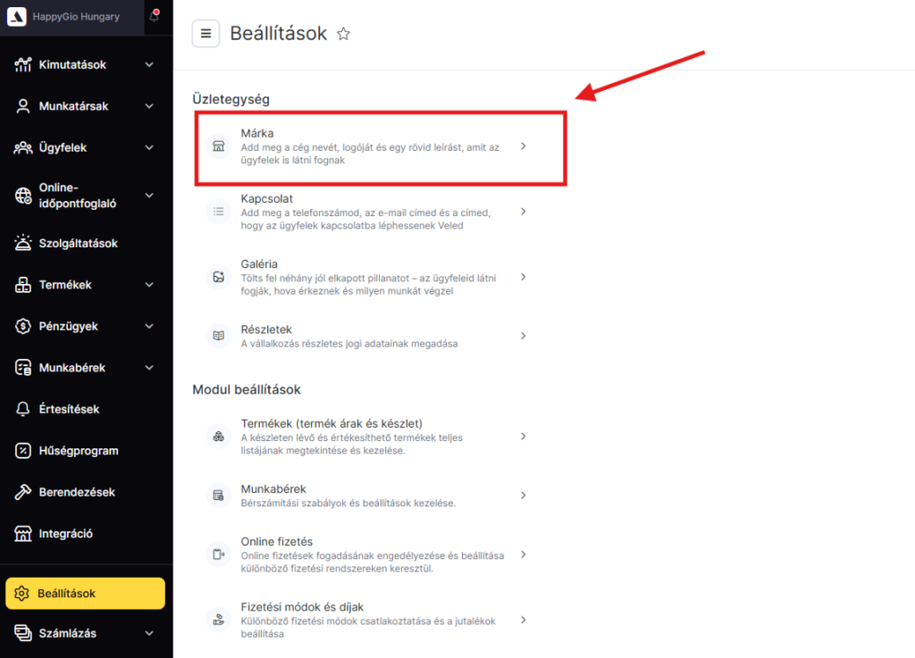 - Az Adminisztráció nézetben lépj a főmenüben lépj a Beállítások > Üzletegység > Márka fülre.