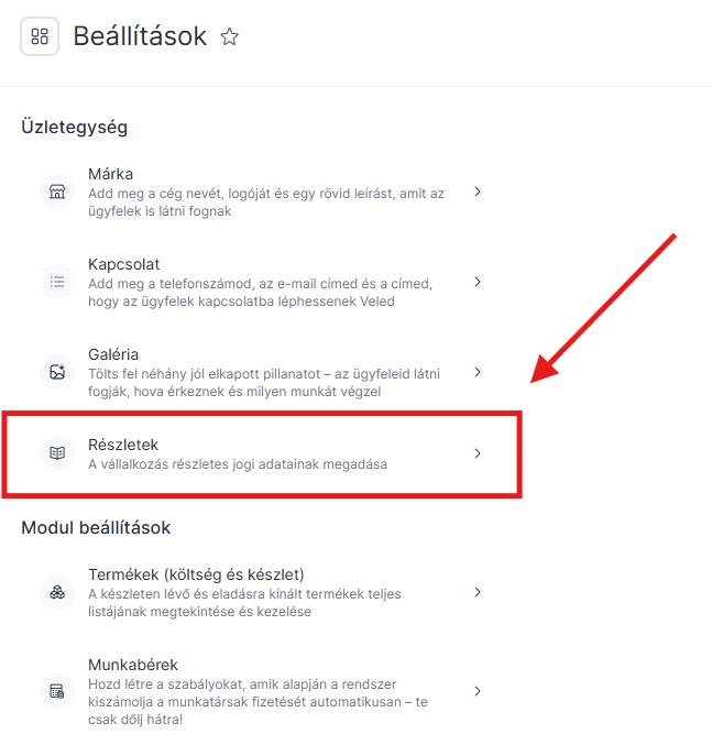 - Lépj a Főmenü Beállítások > Üzletegység > Részletek menüpontba.