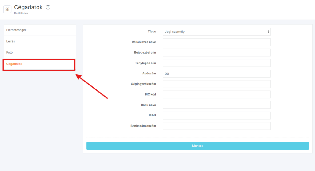 Miután végeztél az elérhetőségek, vállalkozás bemutatkozása és a fotók beállításaival, add meg a cégadatokat.