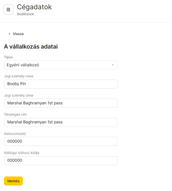A vállalkozás adatai automatikusan megjelennek az előfizetéshez kapcsolódó számlákon. Elég ezt a részt egyszer kitöltened, és nem kell minden alkalommal kézzel megadnod az adatokat.