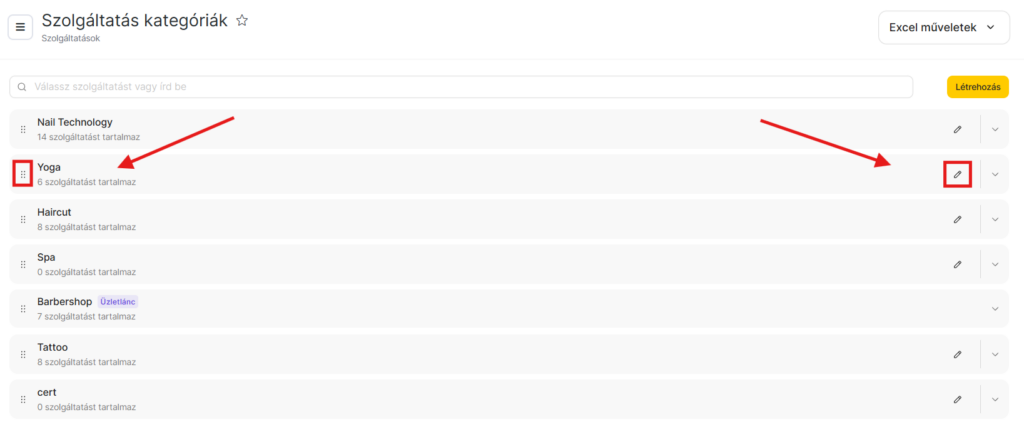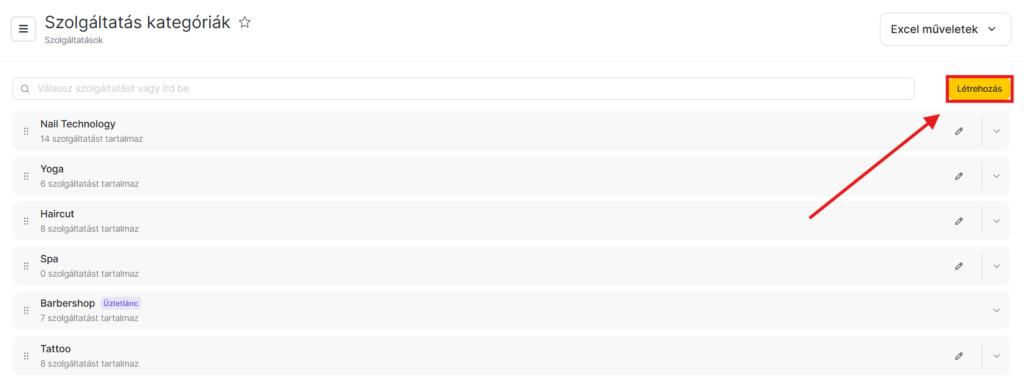 A meglévő szolgáltatások megtekintéséhez kattints a kategória nevével ellátott mappára. Ekkor megjelenik egy legördülő lista, ahol szerkesztheted, törölheted vagy új szolgáltatásokkal bővítheted a listát.