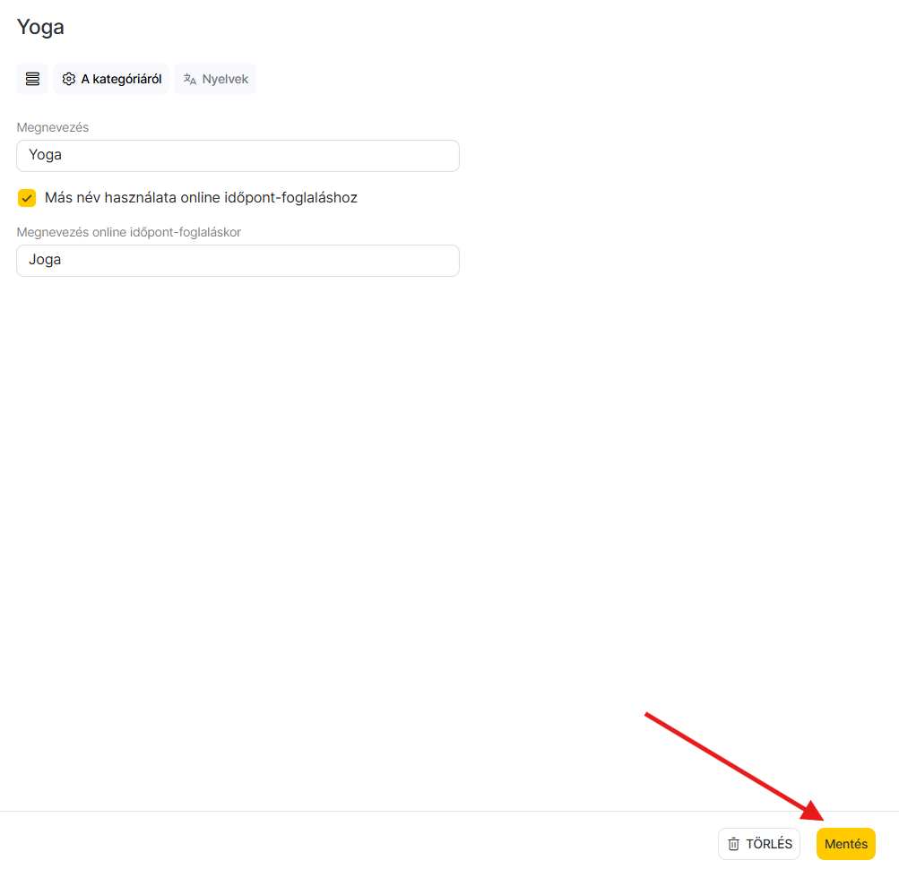 - A Név az online foglaláshoz mezőben add meg azt a kategórianevet, amelyet az ügyfelek látnak majd az online időpontfoglalás során.