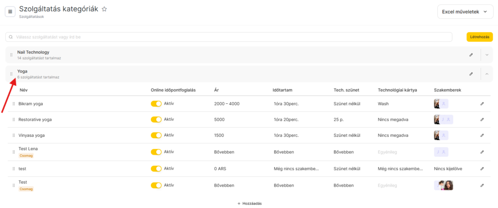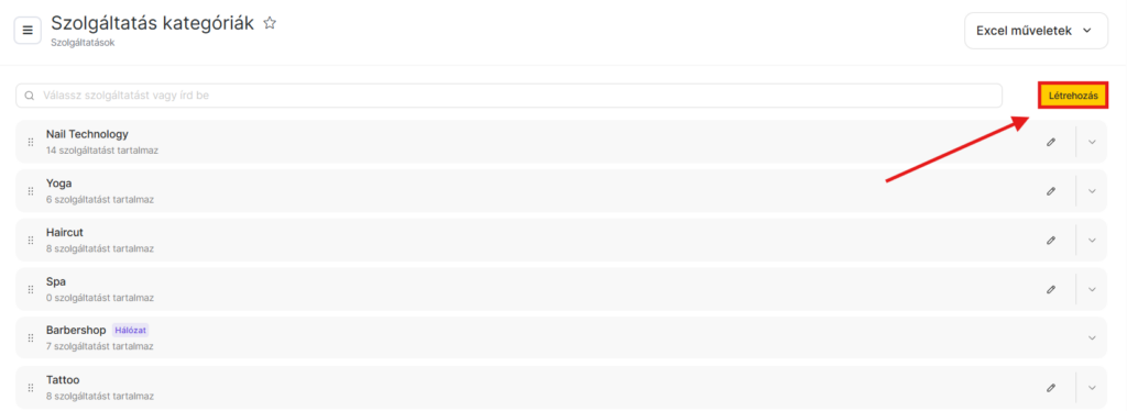 A szolgáltatásokat a kategórián belül a listában is átrendezheted. Ehhez kattints a szolgáltatás neve mellett bal oldalon található pontok ikonra, majd húzd a sort a kívánt pozícióba. Ez a sorrend jelenik meg az online időpont-foglaló widgetben és a digitális naptárban történő foglalás létrehozásakor is.