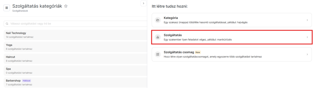 - Válaszd ki a szolgáltatás kategóriáját, például: Hajvágás. Alapértelmezés szerint az a kategória lesz kiválasztva, amelyben éppen létrehozod a szolgáltatást.