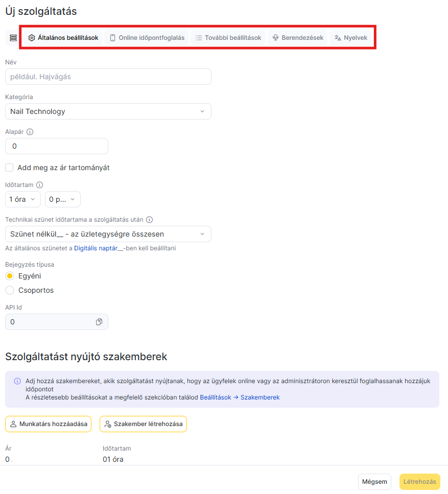 - Egy munkatárs szolgáltatáshoz rendeléséhez nyisd meg a szolgáltatás beállításainál a Fő beállítások fület.