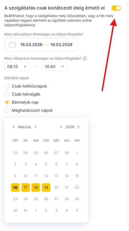 Az online időpontfoglaló widgetben ennél a szolgáltatásnál csak az ebbe az időintervallumba eső időpontok lesznek foglalhatók.