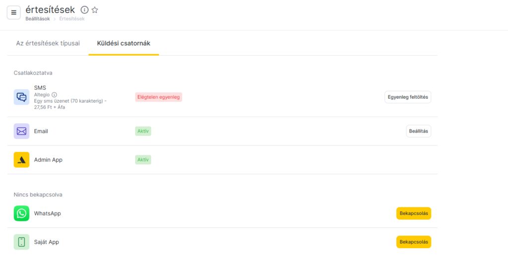 Ahhoz, hogy az értesítések SMS, Email vagy Push csatornán keresztül is kiküldésre kerüljenek, előzetesen be kell állítanod a megfelelő értesítéstípusokat. Erről a cikk korábbi részében olvashatsz.