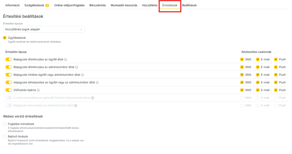 Mielőtt értesítéseket állítanál be egy hozzáféréssel rendelkező munkatársnak, engedélyezned kell a küldési csatornákat a Beállítások > Rendszerbeállítások blokk > Értesítések > Küldési csatornák menüpontban. A küldési csatornák beállításáról részletesen a kapcsolódó cikkben olvashatsz.