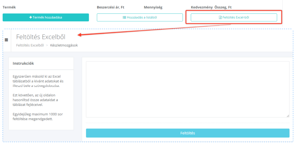 Kattints a Feltöltés Excelből gombra. A lépések részletesen a Termékek hozzáadása Excelből című cikkünkben olvashatóak.