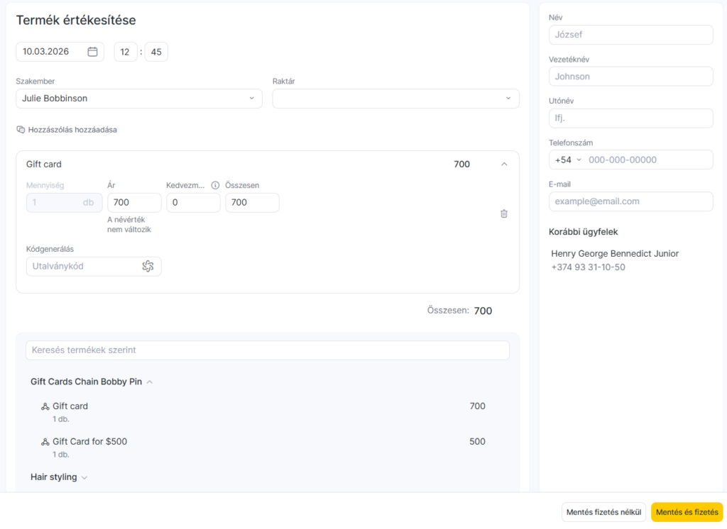 Ha mentés előtt szeretnéd rögzíteni a fizetést, válaszd a Mentés és fizetés lehetőséget. A fizetés történhet: készpénzzel, bankkártyával, hűségprogram segítségével.