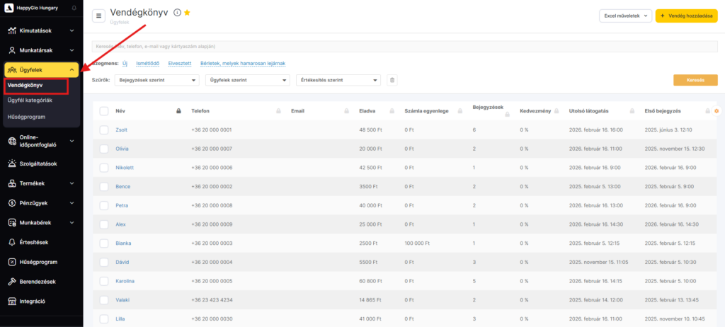A Ügyfelek > Vendégkönyv részben hozzáférhetsz minden olyan ügyfél adataihoz, akik valaha igénybe vették a szolgáltatásaidat. Ez a lista kulcsfontosságú információkat tartalmaz, például a nevüket, elérhetőségeiket, az összes elköltött összeget, igénybe vett kedvezményeket, látogatások számát, valamint az első és utolsó látogatás dátumát.