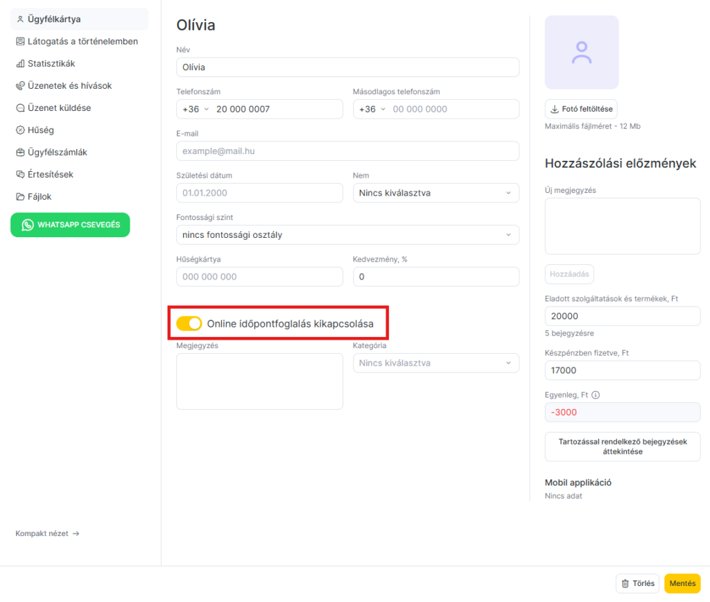 Ahhoz, hogy egy ügyfelet feketelistára helyezz az online időpontfoglalóban lépj a Ügyfelek > Vendégkönyv menüpontra, válaszd ki a kívánt ügyfelet, majd jelöld be az Online időpont-foglalás kikapcsolása jelölőnégyzetet.