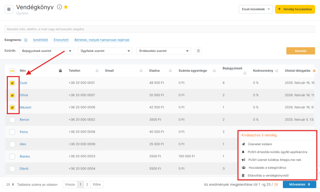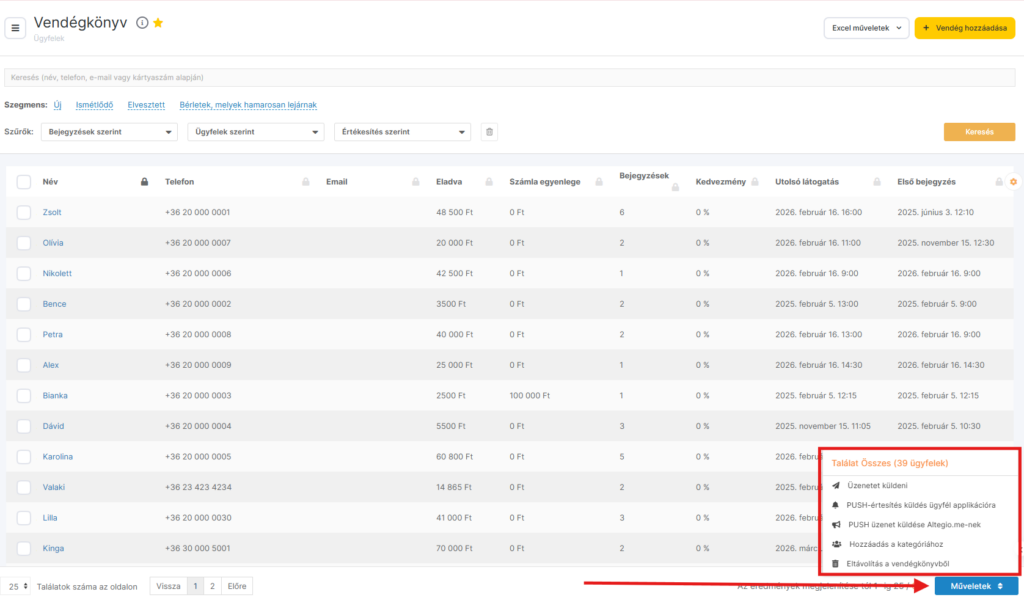 A Vendégkönyv szekció segítségével tömeges üzenetküldést végezhetsz, értesítéseket küldhetsz, ügyfeleket törölhetsz az adatbázisból, kategóriákba sorolhatod őket, valamint Excel fájlként exportálhatod az adatokat. Egy művelet végrehajtásához kattints a Csoportos műveletek gombra, majd válaszd ki a kívánt opciót a listából.