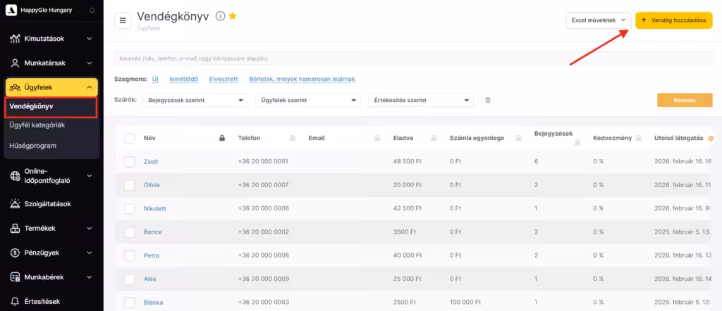 Az Ügyfelek>Vendégkönyv menüpontban manuálisan hozzáadhatsz ügyfelet vagy feltöltheted az ügyfelek listáját Excel táblázatból (erről bővebben ittolvashatsz).