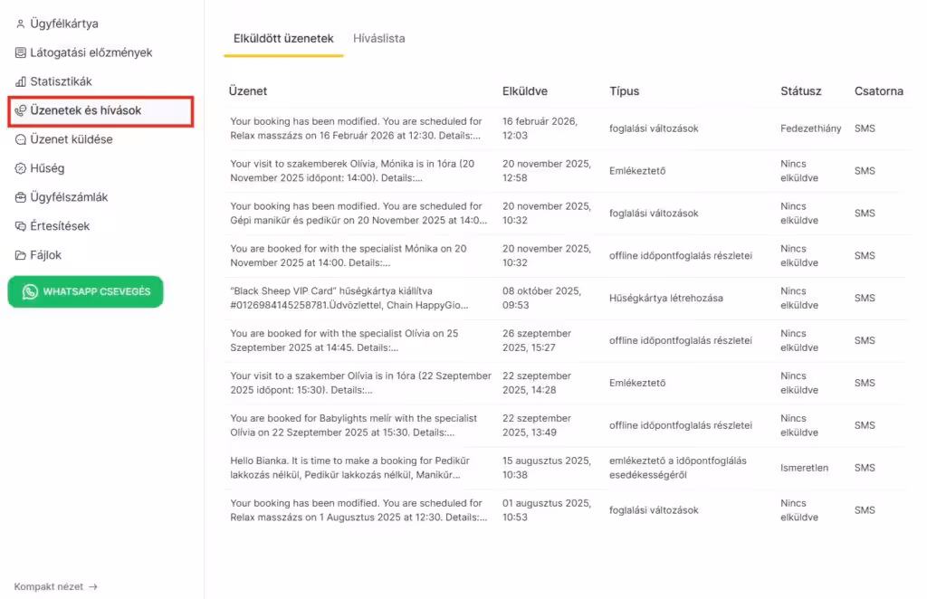 Ebben a részben tekinthető meg az ügyfeleknek elküldött üzenetek listája, üzenetküldési csatornákra bontva. Ezen kívül itt jelennek meg az üzenetek típusai, státusza, a küldés időpontja, az üzenet tartalma és a csatorna.