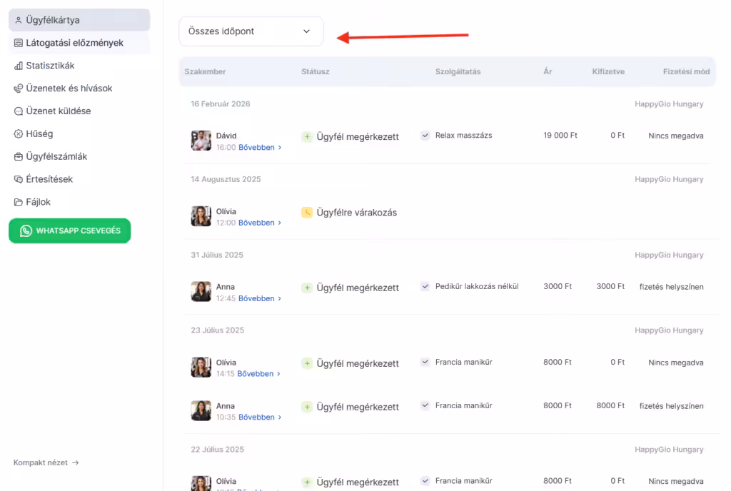 Ebben a részben megtekinthetőek az ügyfél korábbi időpontfoglalásai, a munkatársak listája, akik szolgáltatásait igénybe vette, a szolgáltatások, amelyeket igénybe vett, az általa vásárolt termékek, kedvezmények, az általa kifizetett teljes összeg és a borravalók, a kommentjei, illetve megjelennek azok az üzletegységek, amelyeknél a szolgáltatásokat igénybe vette.