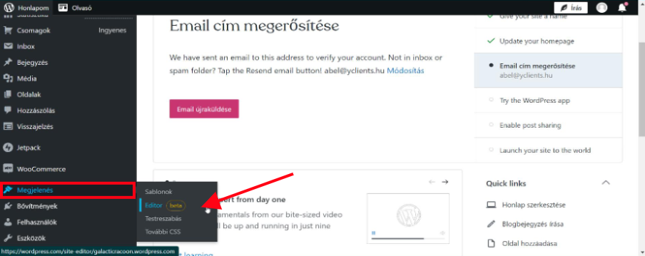 2. A Wordpress logóra kattintva lépjen a WordPress főmenüjébe. A menüben lépjen a Megjelenés – Szerkesztő (Editor) részre.