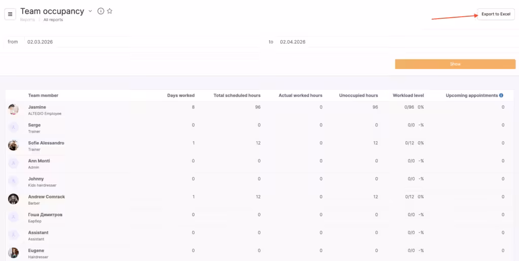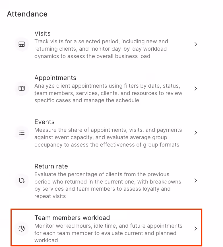 In the Analytical Reports > All reports > Attendance > Team members workload section, you can see the workload of team members. Specify the period for which you want to see the report and click Show.