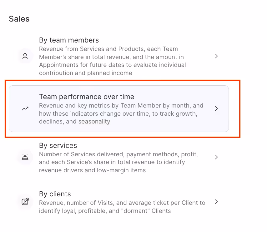 In the Analytical Reports > All reports > Sales > Team Performance Over Time section, you can see a report on team members activity for each month: