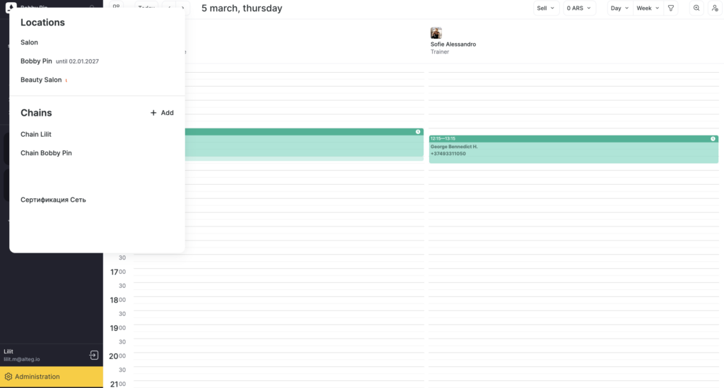 There are two types of spaces in Altegio: locations and chains. Locations — with yellow highlight on the left, chains — with purple highlight on the left. Locations and chains have different sections.