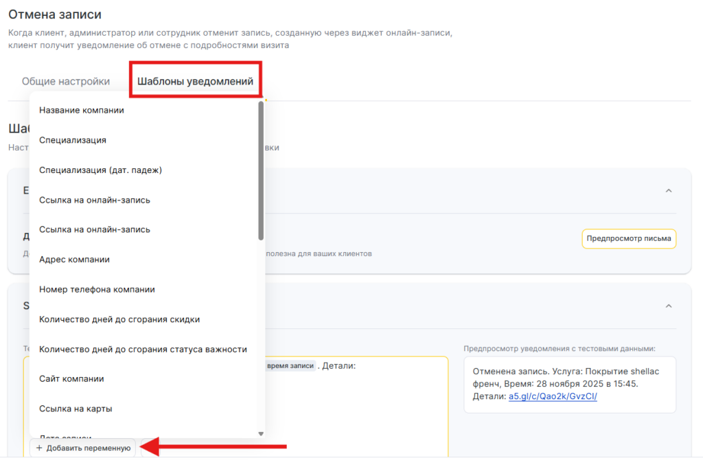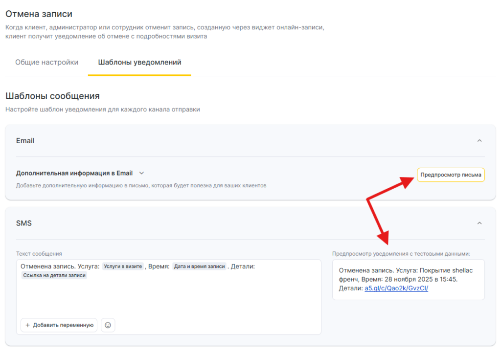 Для всех шаблонов уведомлений доступен предпросмотр — как будет выглядеть сообщение при отправке клиенту, сотруднику или администратору, с учетом переменных.