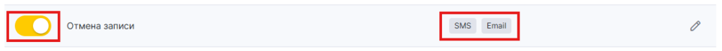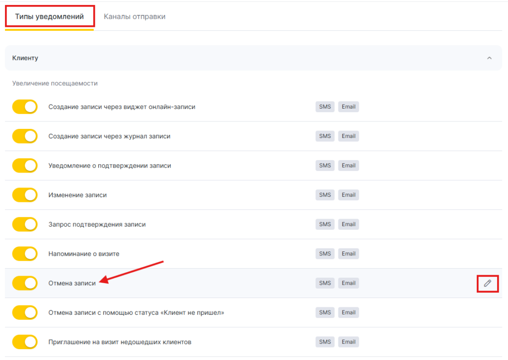 1. В блоке Клиенту выберите тип Отмена записи, нажав на название уведомления или иконку карандаша.