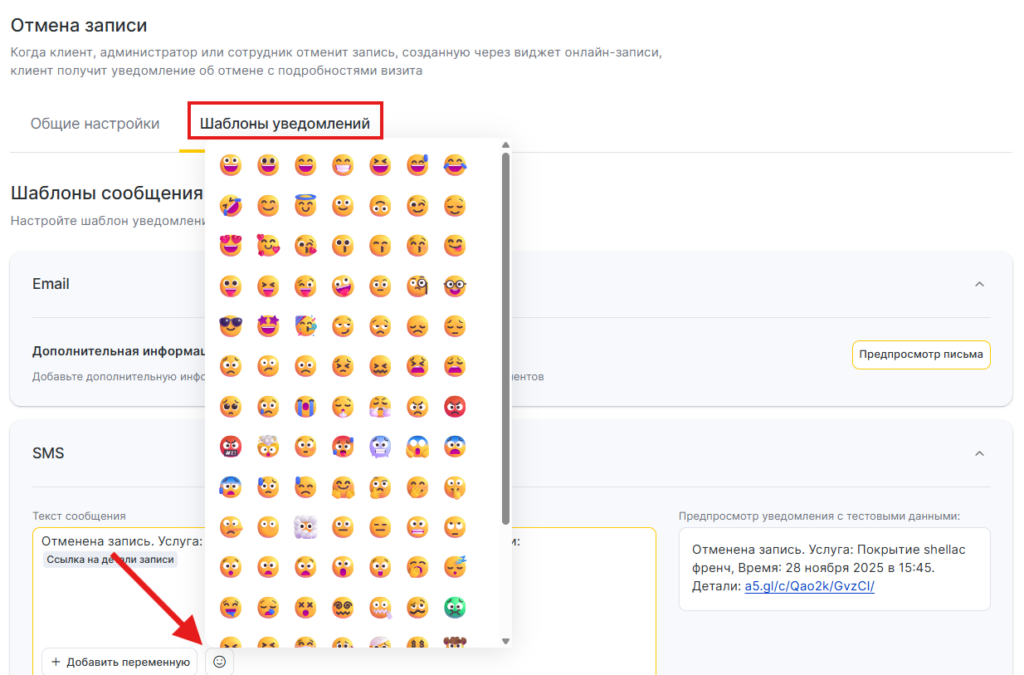 1. В SMS-шаблонах уведомлений вы можете использовать Emoji смайлы, для этого нажмите на кнопку со смайлом и выберете нужный из предложенных или добавьте свой.