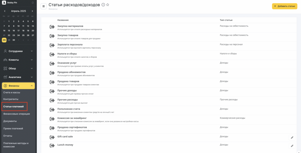 По умолчанию в Altegio задано 12 статей платежей: